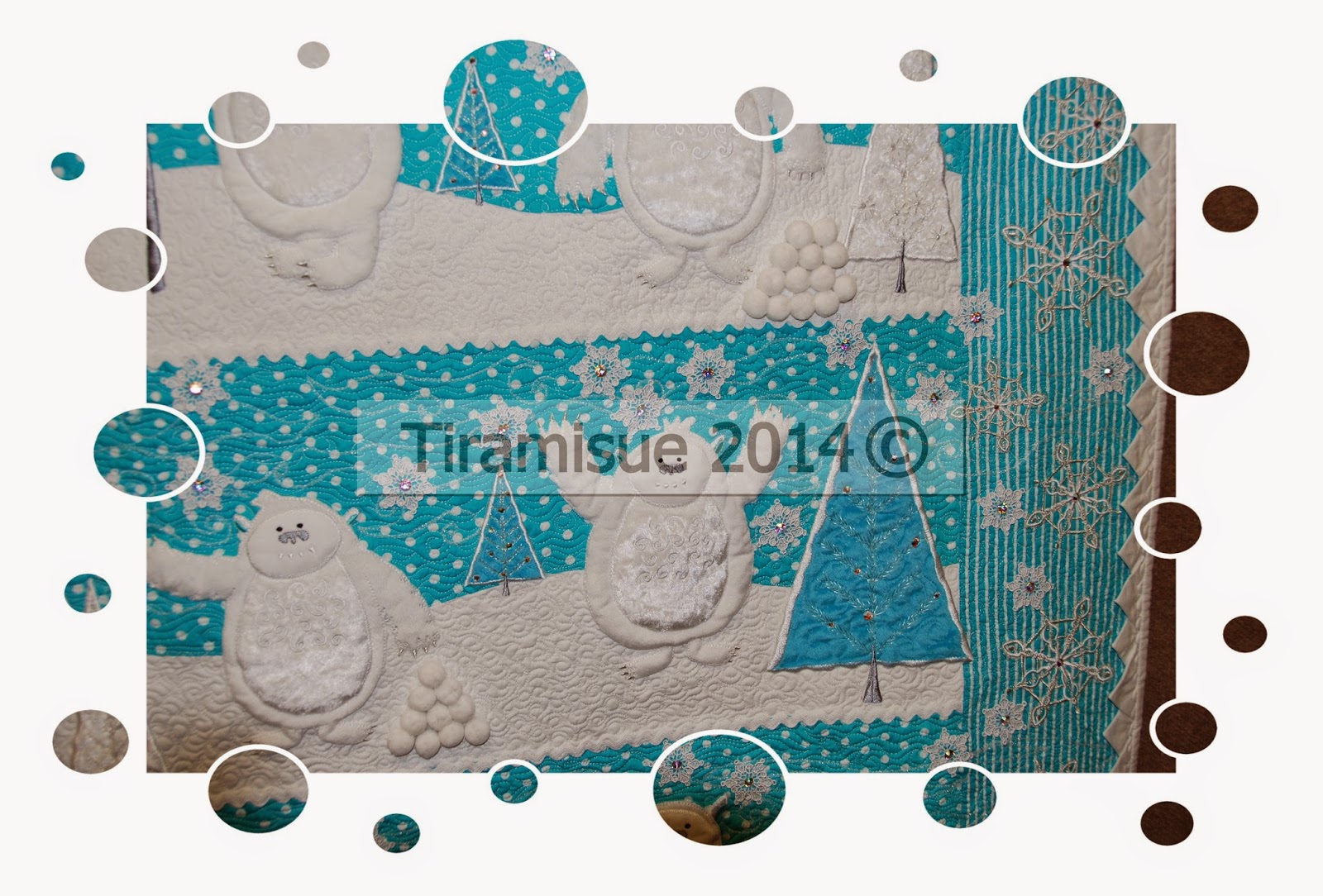 Non embroidery machine people often think that all this comes together by just pressing a button. Let me tell you, "that so ain't the case!" The icicles across the top equate to about 200,000 stitches alone. The snowflakes were stitched on to wash away fabric and I stitched 22 at a time = about 7 hours of stitching. So yes, it all just happens at the press of a button!