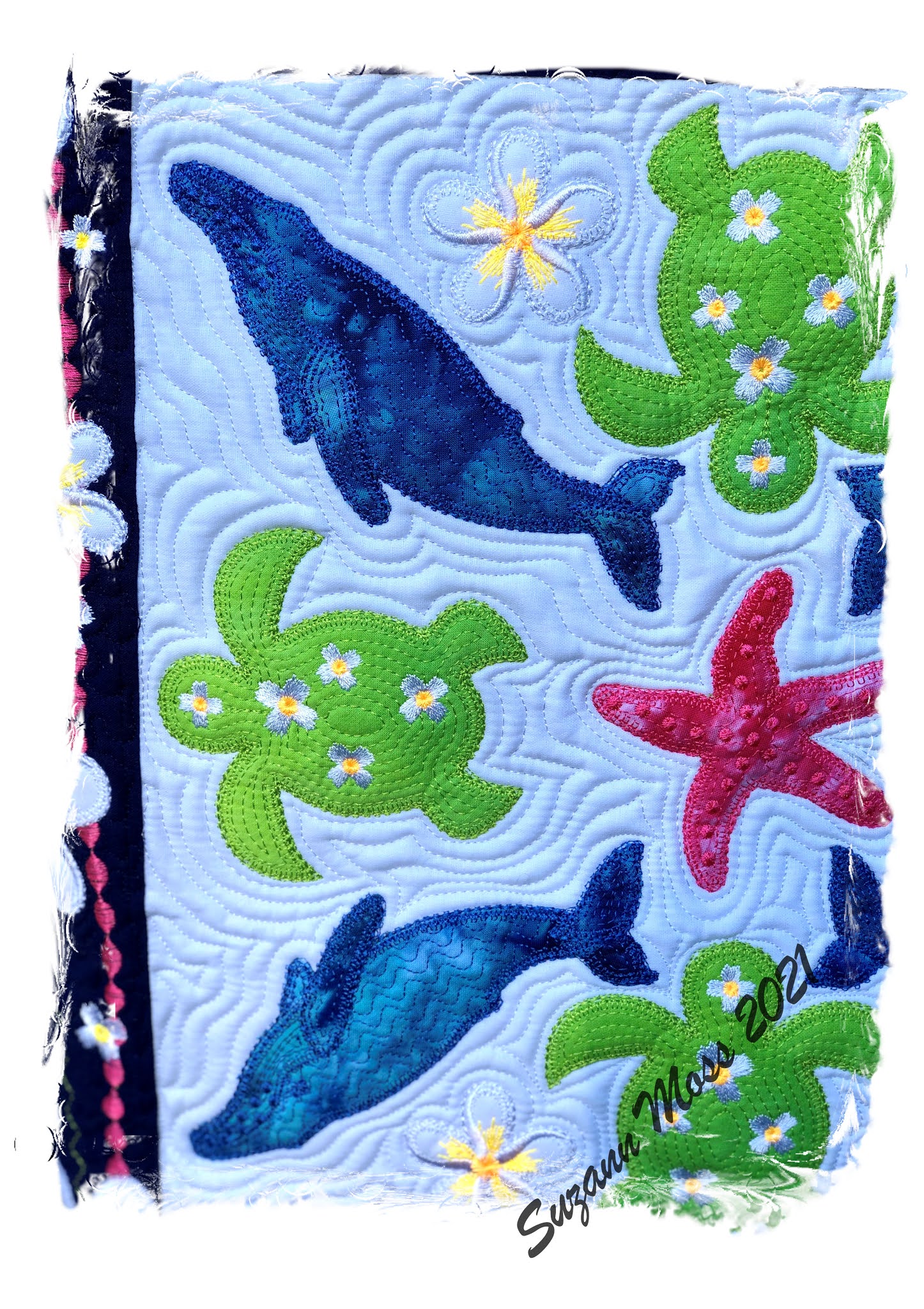 Finished today. Large tote bag with humpbacks, turtles, starfish and plenty of plumeria. Highly over decorated as is my 'style'. If you like it and you want it - $90 and it is a done deal! It has open pockets, it has a zipper secure pocket and a couple of lobster clips to attach your keys to stop them being lost in the great cavern. The back features a quilted pattern of large whale, starfish and turtle and free motion work.